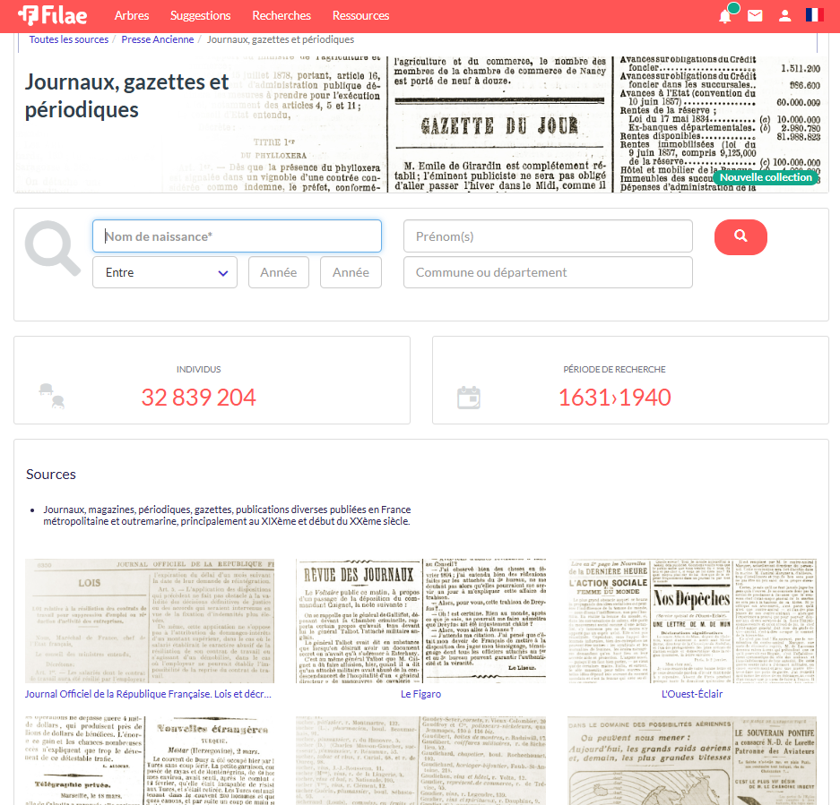Collections | Filae /ressources/ Vos origines vont vous étonner Fri, 05 Dec 2025 15:08:11 +0000 fr-FR hourly 1 https://wordpress.org/?v=6.9 Nouveauté : La presse ancienne arrive sur Filae ! /ressources/nouveaute-la-presse-ancienne-arrive-sur-filae/ Fri, 05 Dec 2025 14:56:37 +0000 /ressources/?p=15789 Nous sommes ravis de vous annoncer l’arrivée d’une nouvelle collection majeure sur Filae : la Presse Ancienne 📰. Découvrez dès maintenant la première mise en ligne de journaux, magazines, périodiques et gazettes publiés principalement au XIXème et au début du XXème siècle.