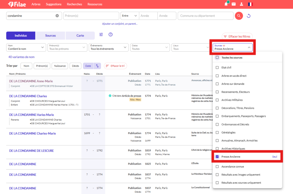 2. Dans les résultats, utilisez le filtre Sources pour sélectionner ou non la Presse Ancienne.