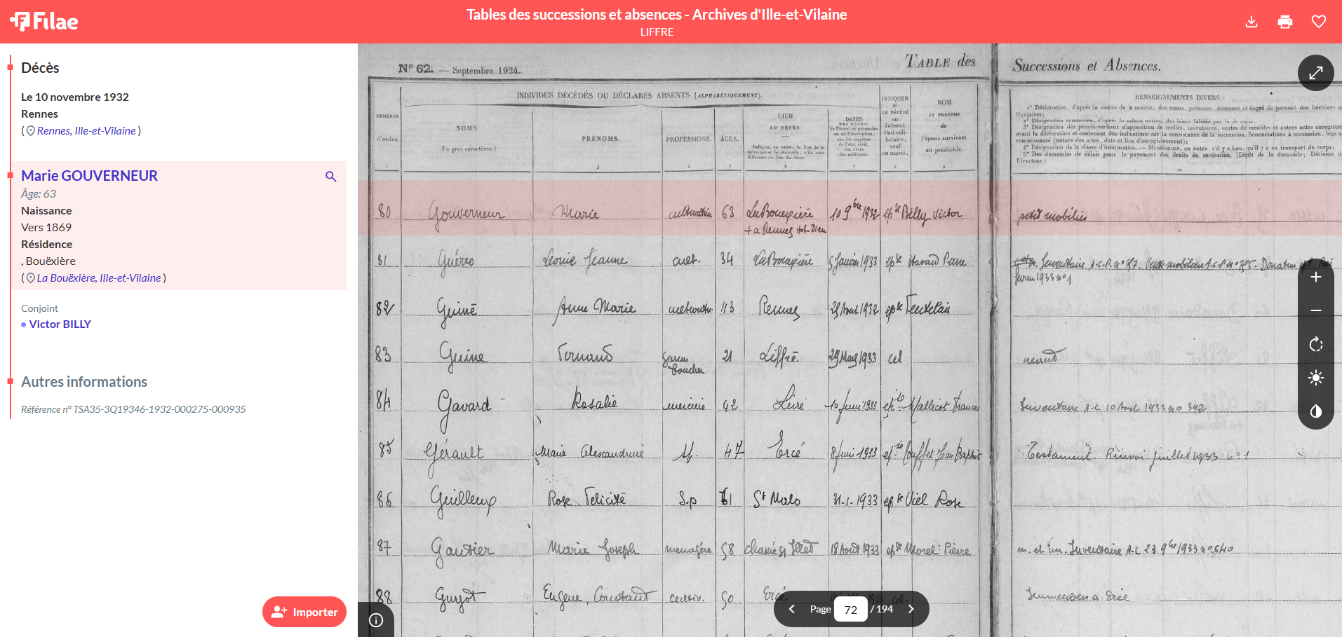 💡 Astuce : Utilisez le bouton d’Import présent sur la fiche résumé pour ajouter directement l’information et la source à votre arbre généalogique !