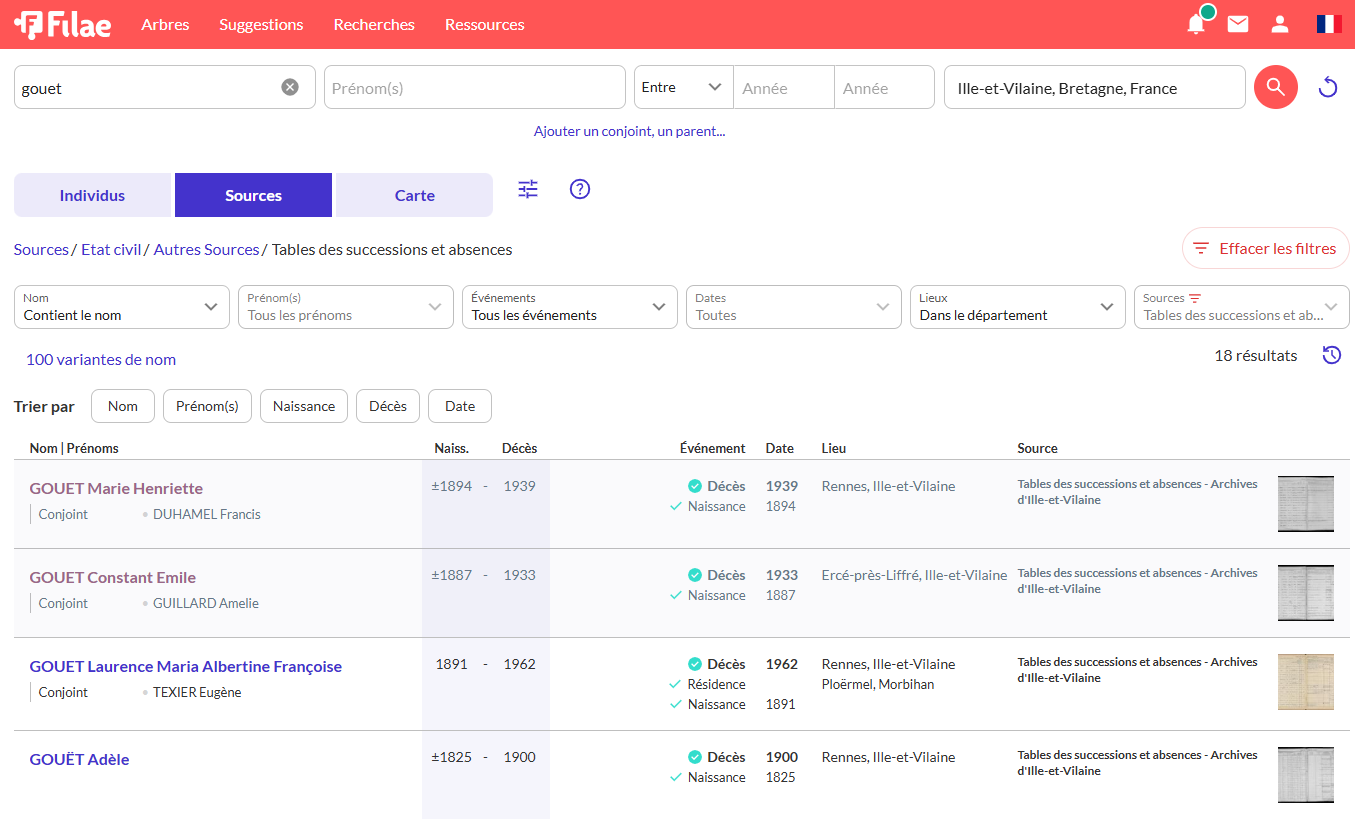 L’Ille-et-Vilaine rejoint la liste croissante des départements déjà indexés. Pour savoir si vos autres départements de recherche sont déjà couverts par ce service, consultez la FAQ :Quelles tables de successions et absences sont disponibles sur Filae ?.