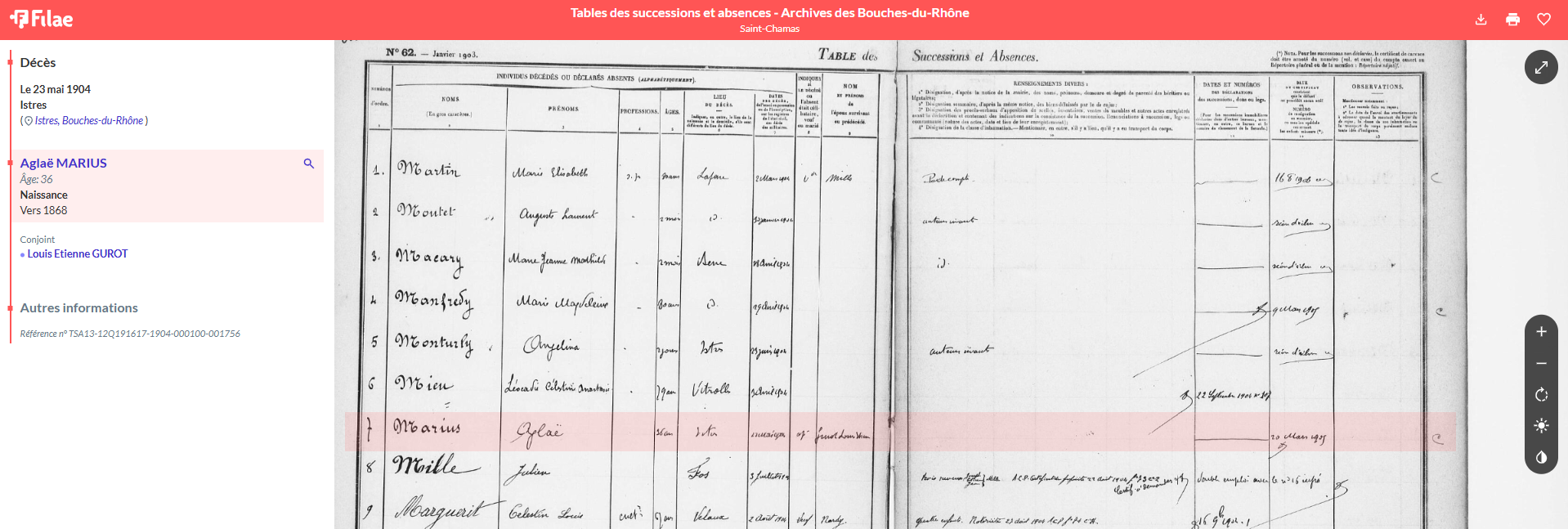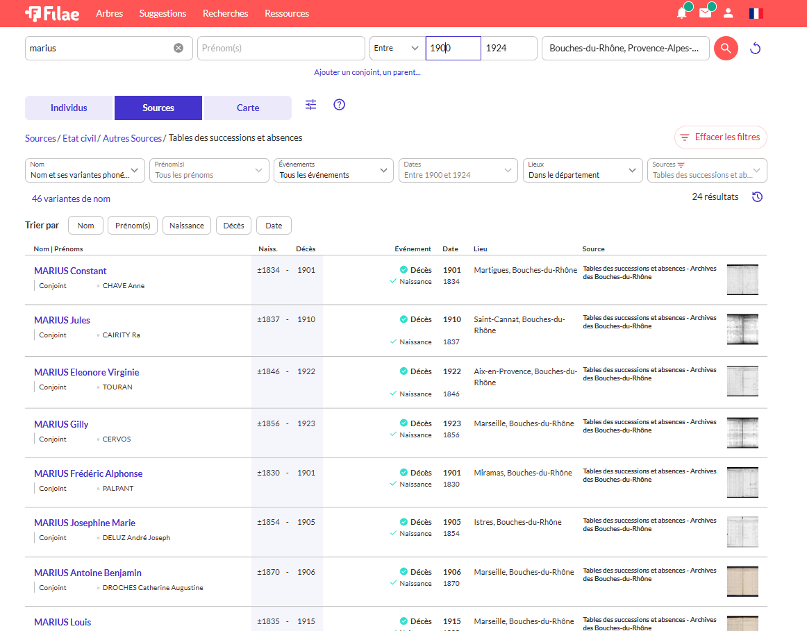 Les Bouches-du-Rhône rejoignent la liste croissante des départements déjà indexés. Pour savoir si vos autres départements de recherche sont déjà couverts par ce service, consultez la FAQ :Quelles tables de successions et absences sont disponibles sur Filae ?.