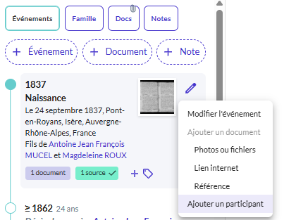 Sur votre arbre Filae, cliquez sur une personne pour ouvrir le volet de saisie ou cliquez sur Fiche. Vous allez ensuite ajouter des événements, des documents et des notes en saisissant les informations principales et des détails.