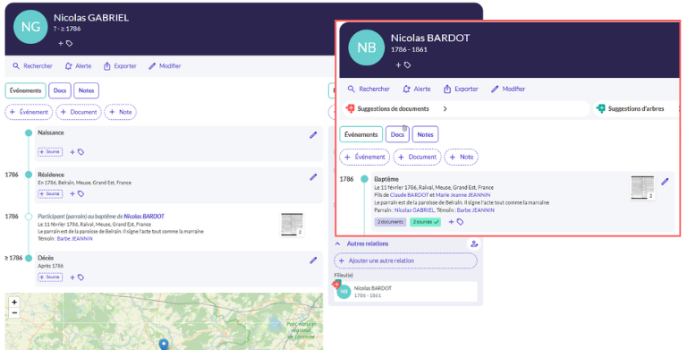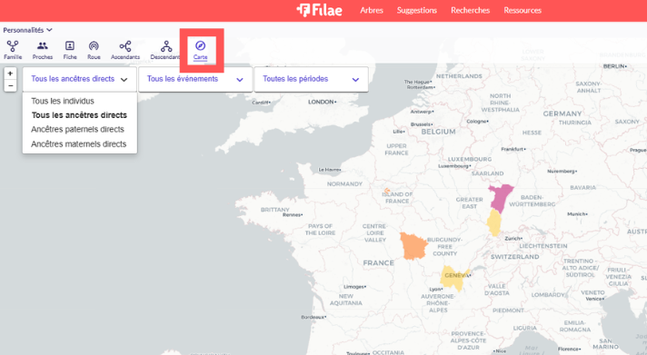 • La carte interactive : Zoomez sur une région pour voir quels ancêtres y ont vécu. C’est souvent là que l’on réalise que deux branches se croisent géographiquement.