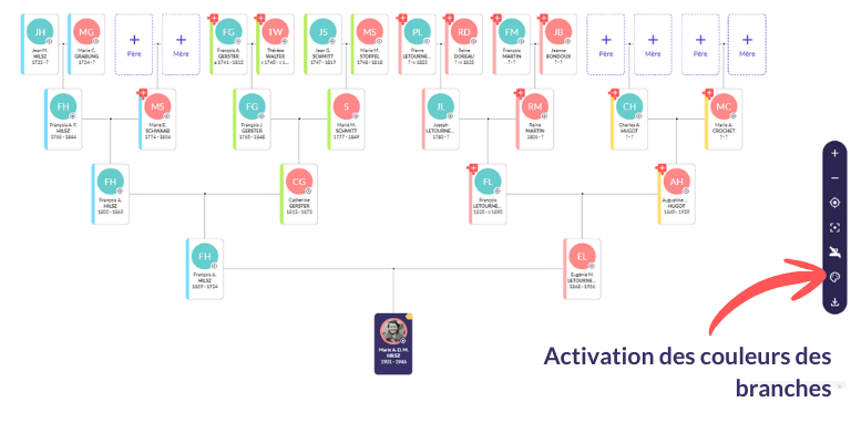 2. Code couleur : Activez la colorisation des 4 branches (bleu, vert, rose, jaune). Un trait jaune sur une fiche ? C’est un ancêtre de votre branche grand-mère paternelle !