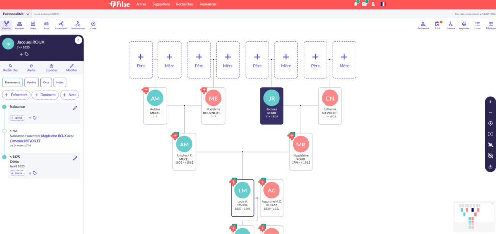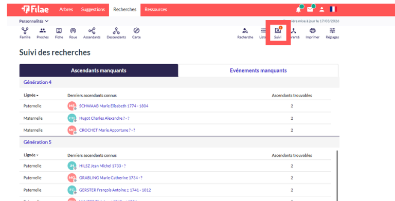 3. Suivi de recherche : Filae vous indique automatiquement les événements manquants pour vos ancêtres directs.
