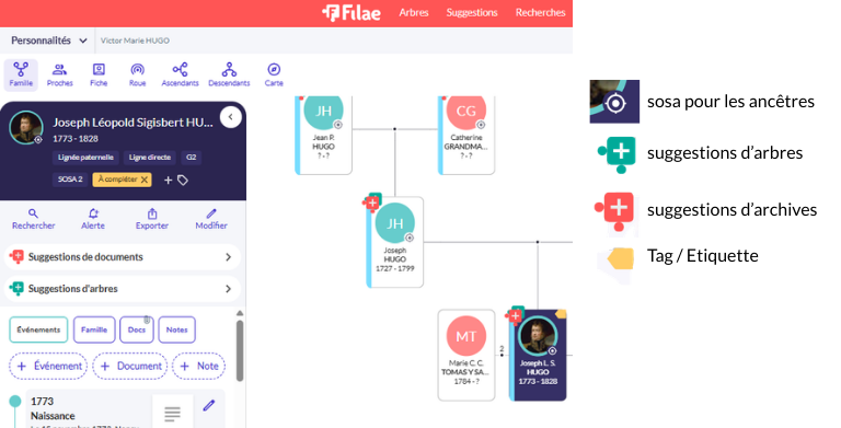 Pour que l’outil soit efficace, définissez-vous (ou la personne de votre choix) comme racine de l’arbre. Filae calculera automatiquement la numérotation sosa :