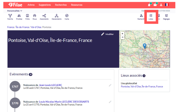• La liste des lieux : Une mine d’or pour voir chronologiquement tous les événements d’une même commune.