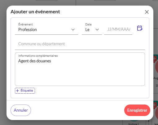 • Vous pouvez également créer des événements personnalisés (ex: « Décoration » pour un médaillé de la Résistance comme dans les fichiers Arko).