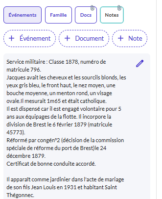 C’est ici que vous déposez les anecdotes, les descriptions physiques ou les faits marquants (médailles, condamnations, mentions militaires).
