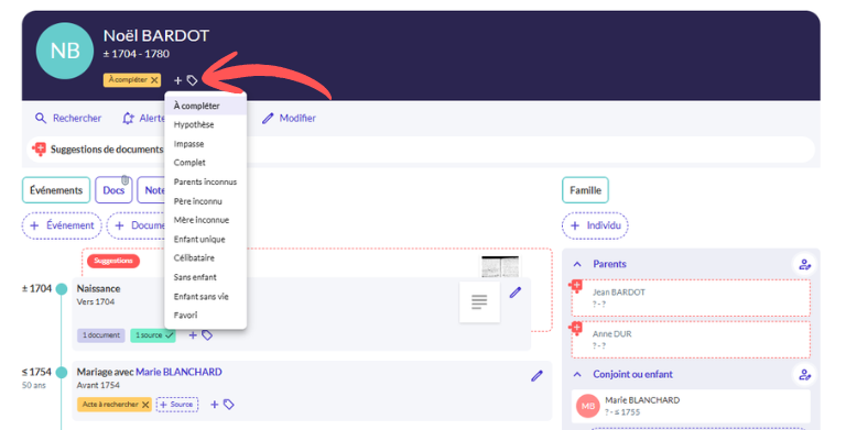 Marquez vos fiches pour les repérer en un clin d’œil : « Père inconnu », « Impasse », « Acte à rechercher » ou « Hypothèse ». Ces étiquettes vous permettent de filtrer vos recherches en quelques secondes.