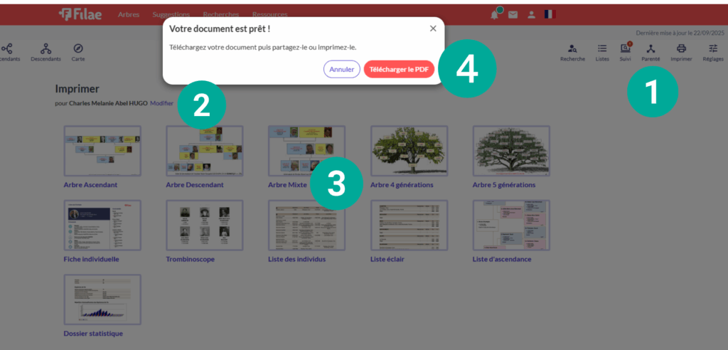 Pour vos impressions et export, Filae vous propose des arbres avec :