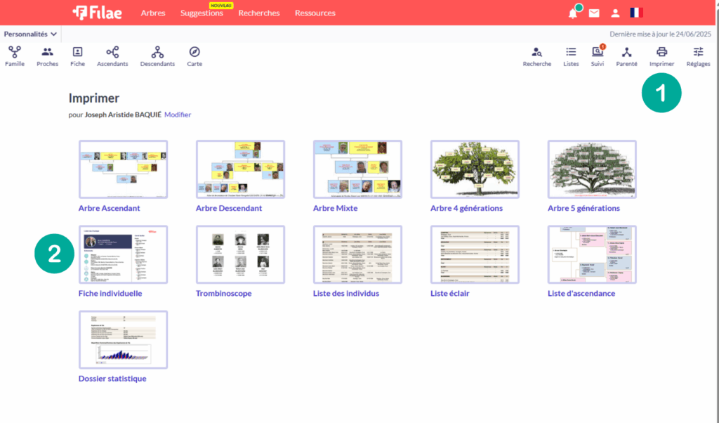 - La personne dont l'arbre sera réalisé apparaît. Vous pouvez cliquer sur Modifier afin de sélectionner un autre individu (2)