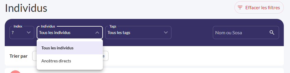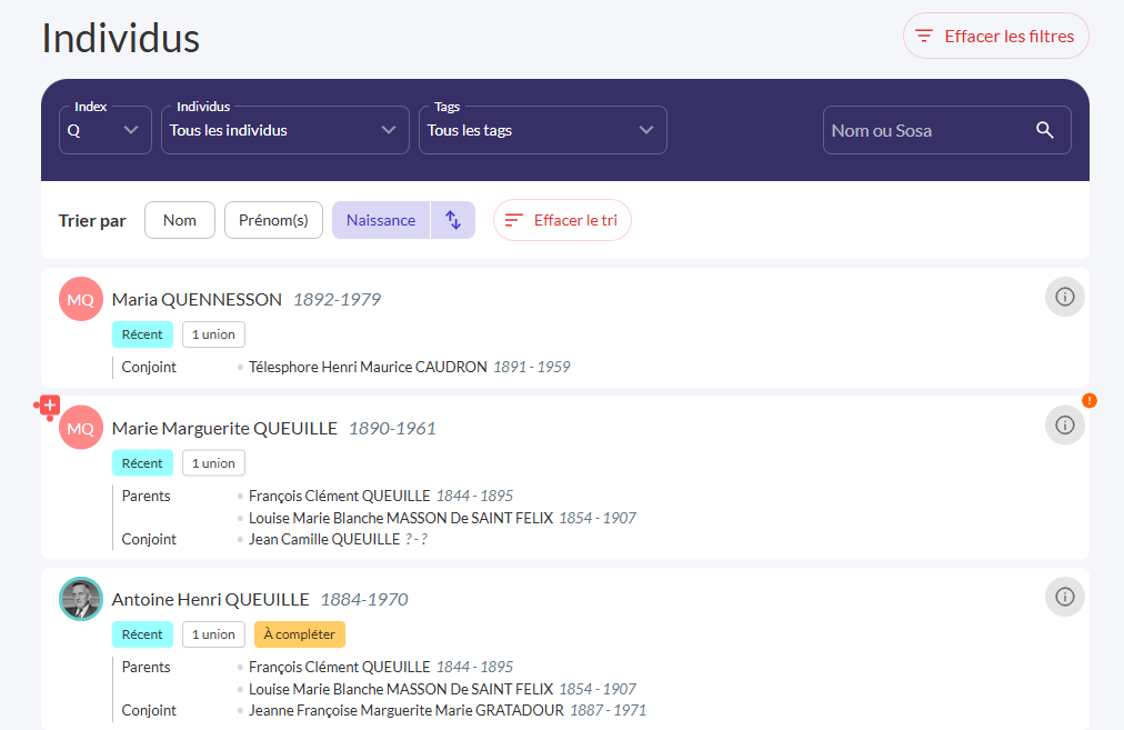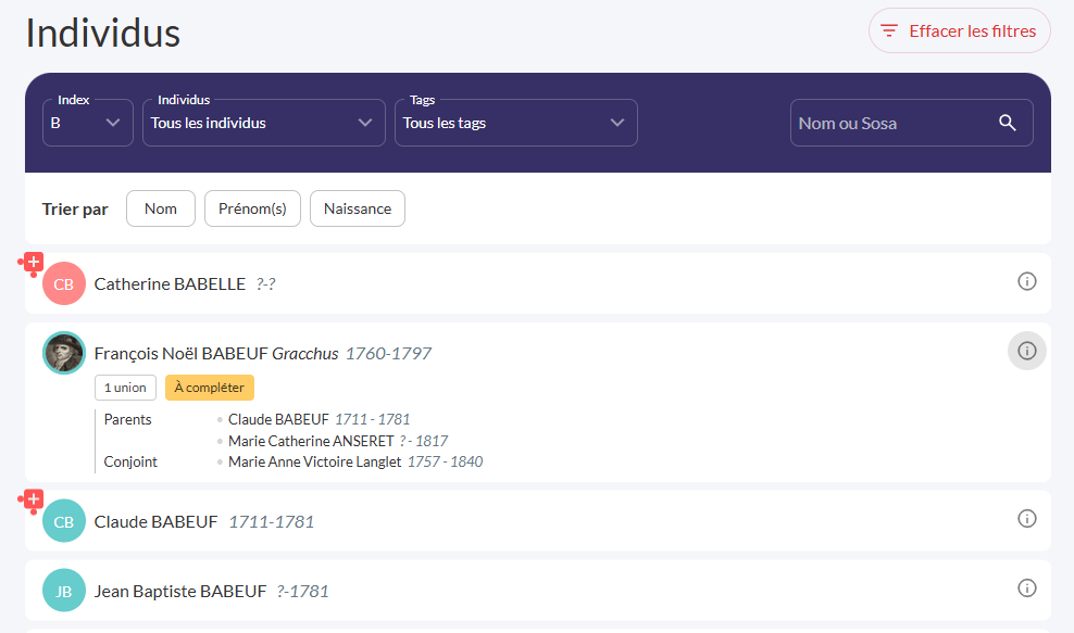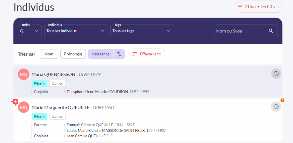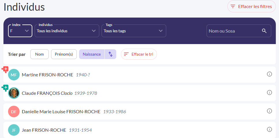 La liste des individus évolue avec notamment des informations complémentaires pour distinguer les personnes ou voir uniquement les ancêtres.