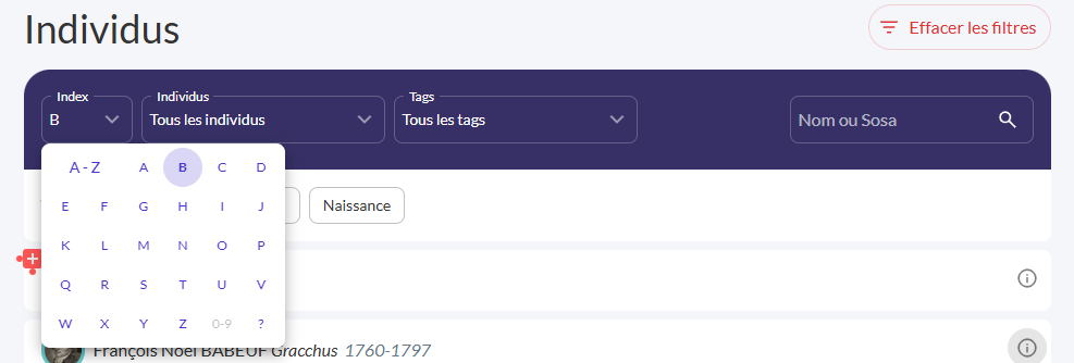 L’index permet de choisir de A à Z ou la première lettre du nom. En cliquant sur le point d’interrogation, vous avez les individus sans noms de famille.