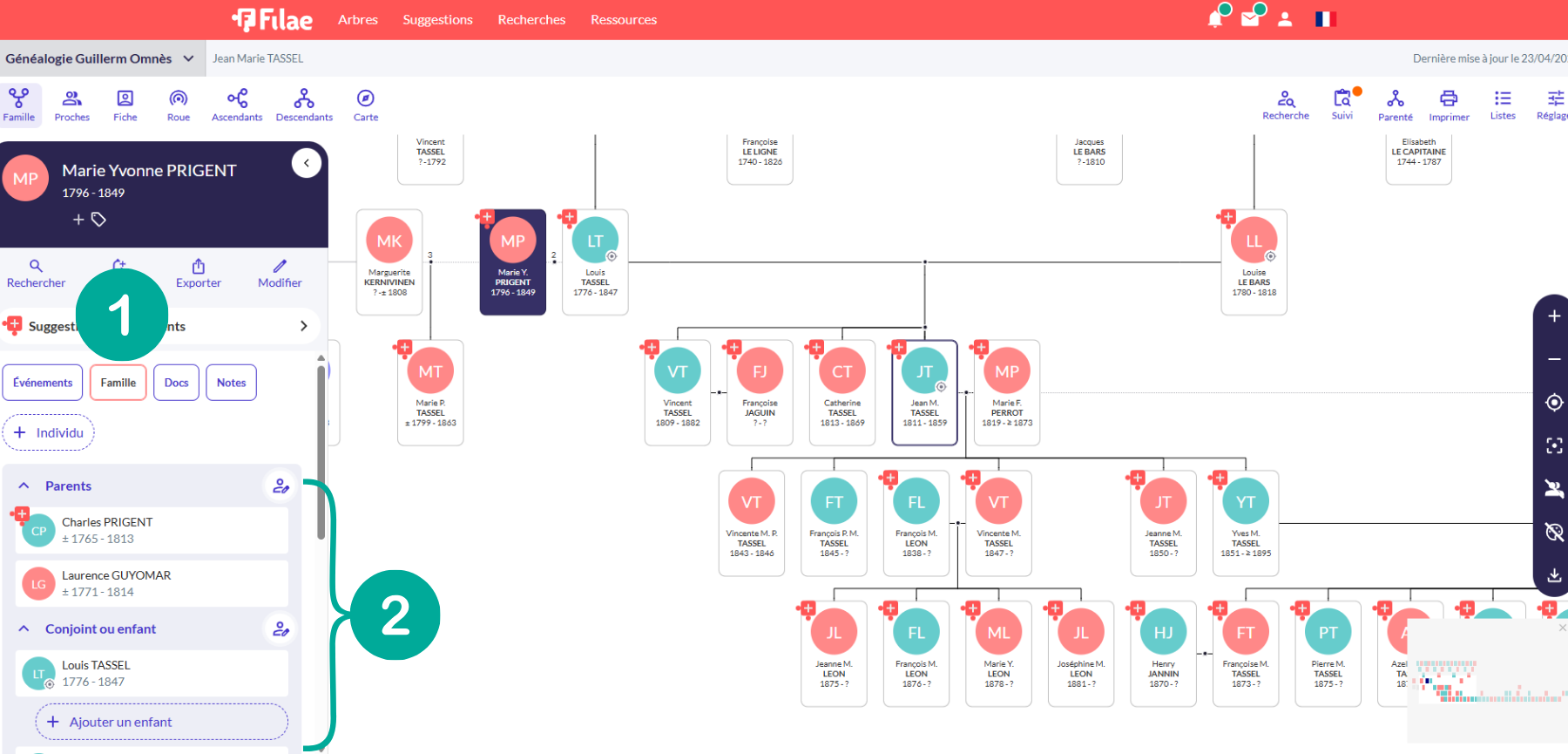 Comme vous le savez, le volet de saisie d’un individu propose un bouton Famille (1). Celui-ci permet de visualiser d’un coup d’œil l’entourage immédiat d’une personne (2) sans avoir à recentrer tout votre arbre :