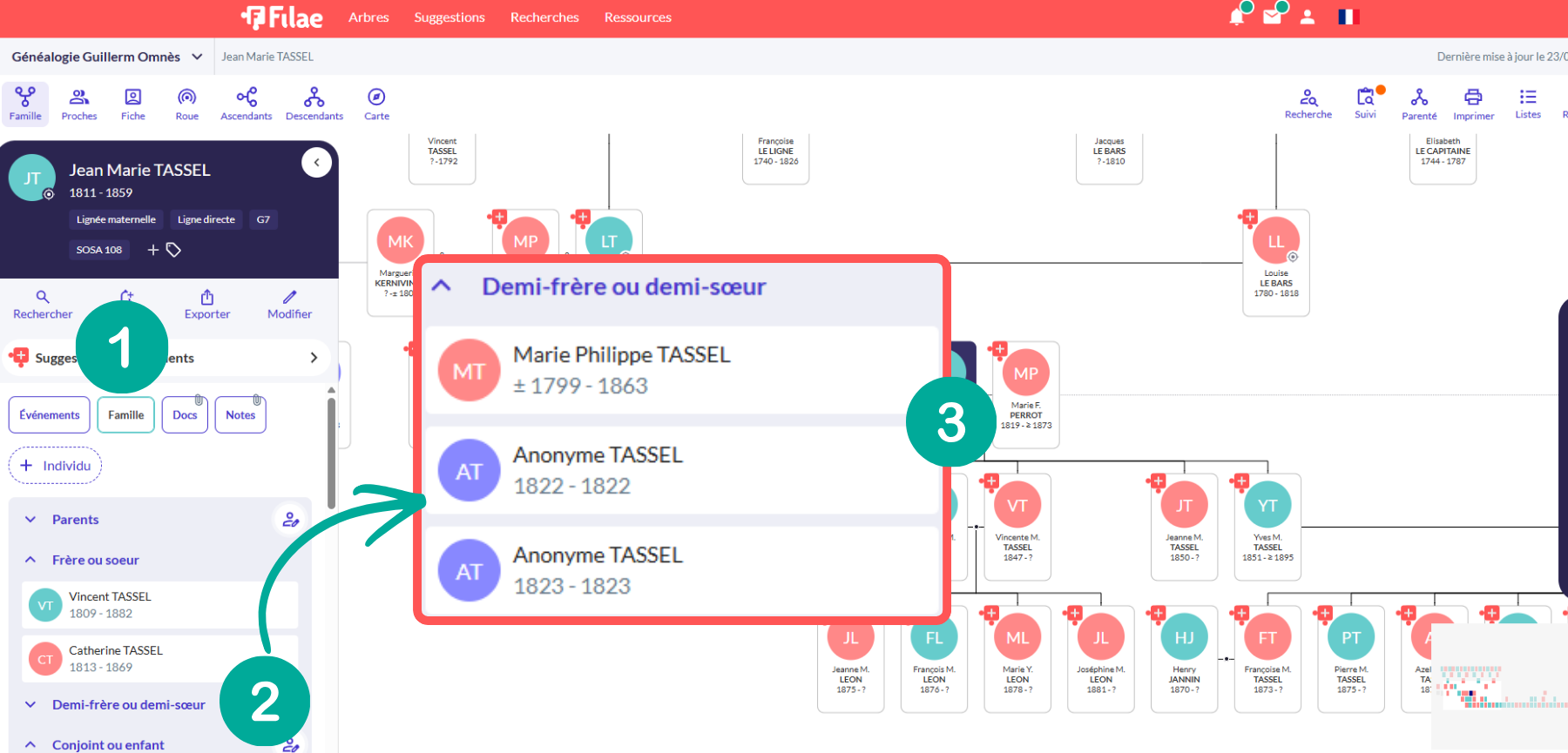 Désormais, si l’individu sélectionné a des demi-frères ou demi-sœurs, une partie « demi-frère ou demi-sœurs » apparaît instantanément dans Famille (1) :